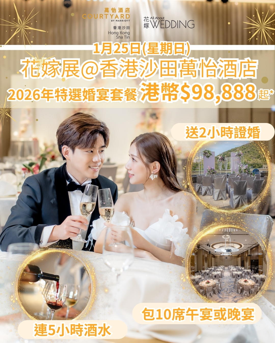 誠邀您與另一半於 1 月 25 日(星期日) 親臨 「花嫁展 @ 香港沙田萬怡酒店」,參與全日精彩活動及尊屬禮遇,助您輕鬆備婚,一站式策劃理想婚禮。