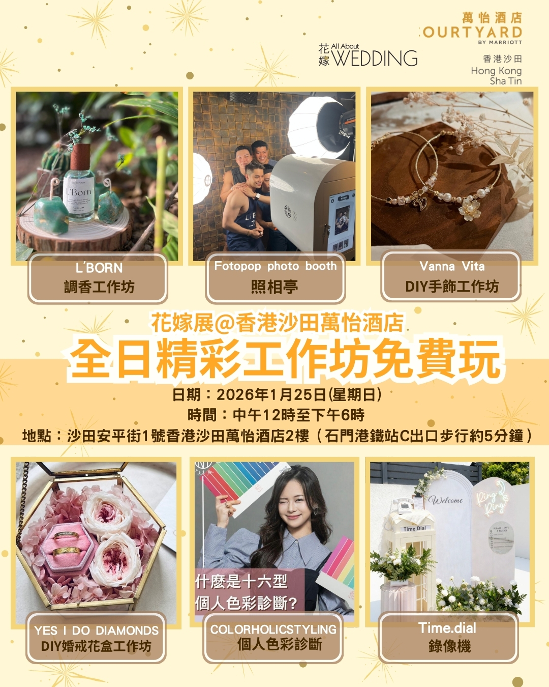 工作坊包括:調香工作坊 @L’BORN,照相亭 @fotopop_tech,DIY手飾 @Vanna__vita,DIY婚戒花盒工作坊 @yesidodiamonds,個人色彩診斷 @colorholicstyling,錄像機 @time.dial