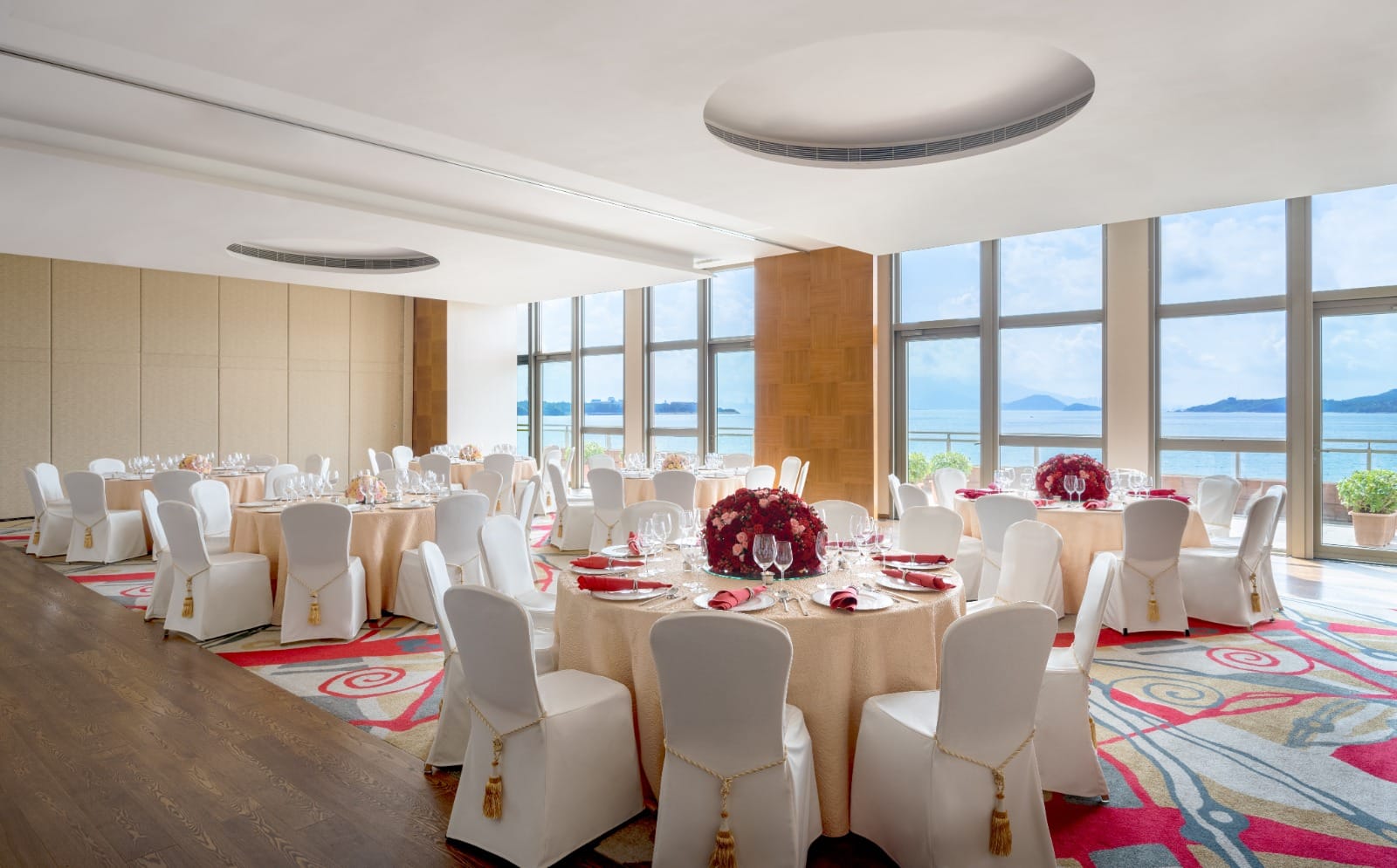 海嵐廳位於酒店一樓,面積為349平方米,場地設計靈活多變,適合不同形式的婚宴及活動。全廳以落地玻璃窗引入充沛自然光,空間明亮開揚,賓客可一邊享受婚宴,一邊飽覽遼闊迷人的海景,締造輕鬆而高雅的婚禮氛圍。