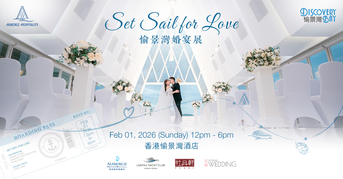 親身參加《SET SAIL FOR LOVE 愉景灣婚宴展》,環島婚禮導賞團將帶領新人走訪島上婚禮場地,更可免費參加人氣婚嫁工作坊,一次過獲取2026年最新婚禮靈感。