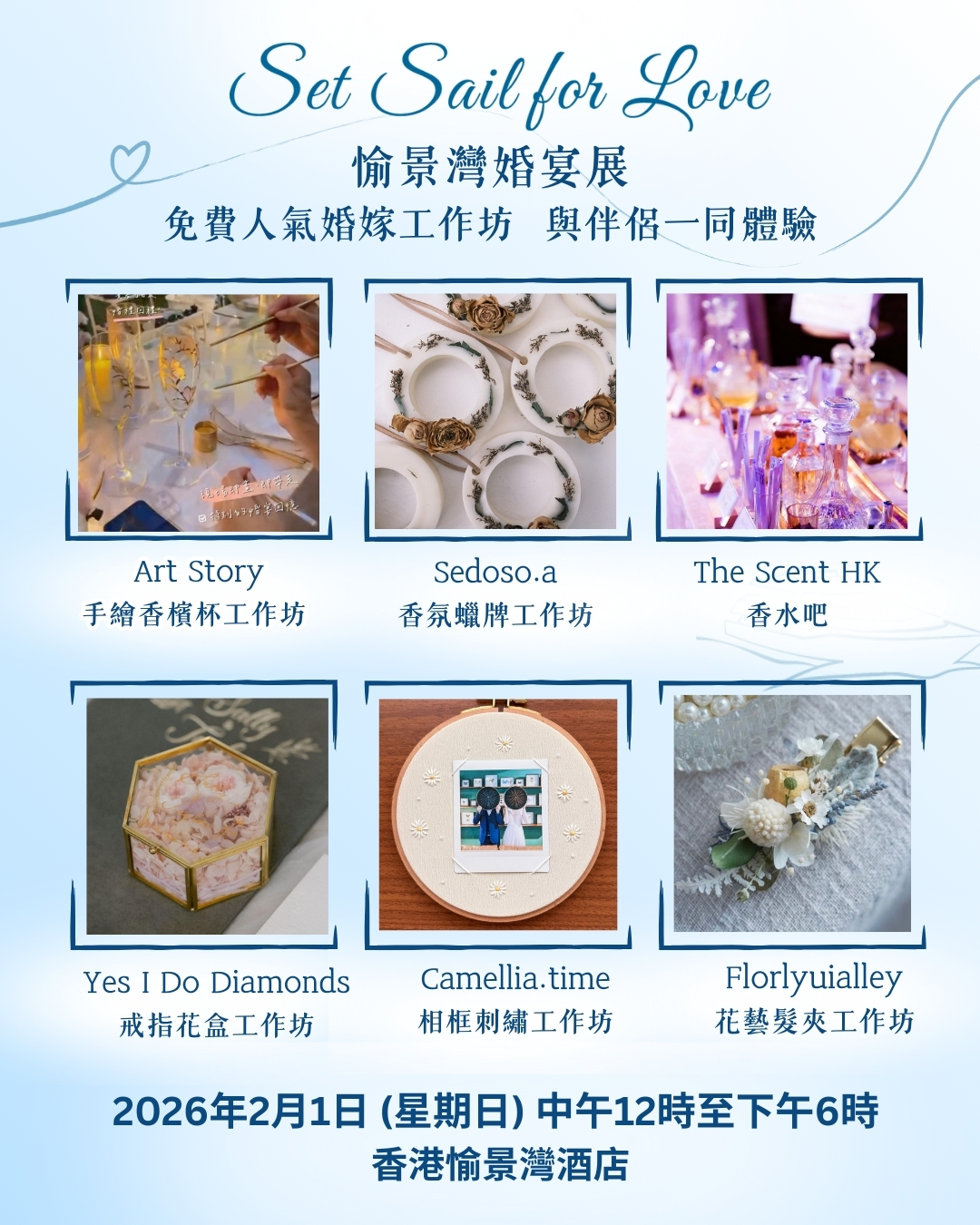 2026年2月1日(星期日)《SET SAIL FOR LOVE 愉景灣婚宴展》立即按此連結了解愉景灣的獨家婚宴禮遇|免費參加人氣婚嫁工作坊(手繪香檳杯、香氛蠟牌、戒指花盒、刺繡相框、花藝髮夾、香水吧)名額有限先到先得