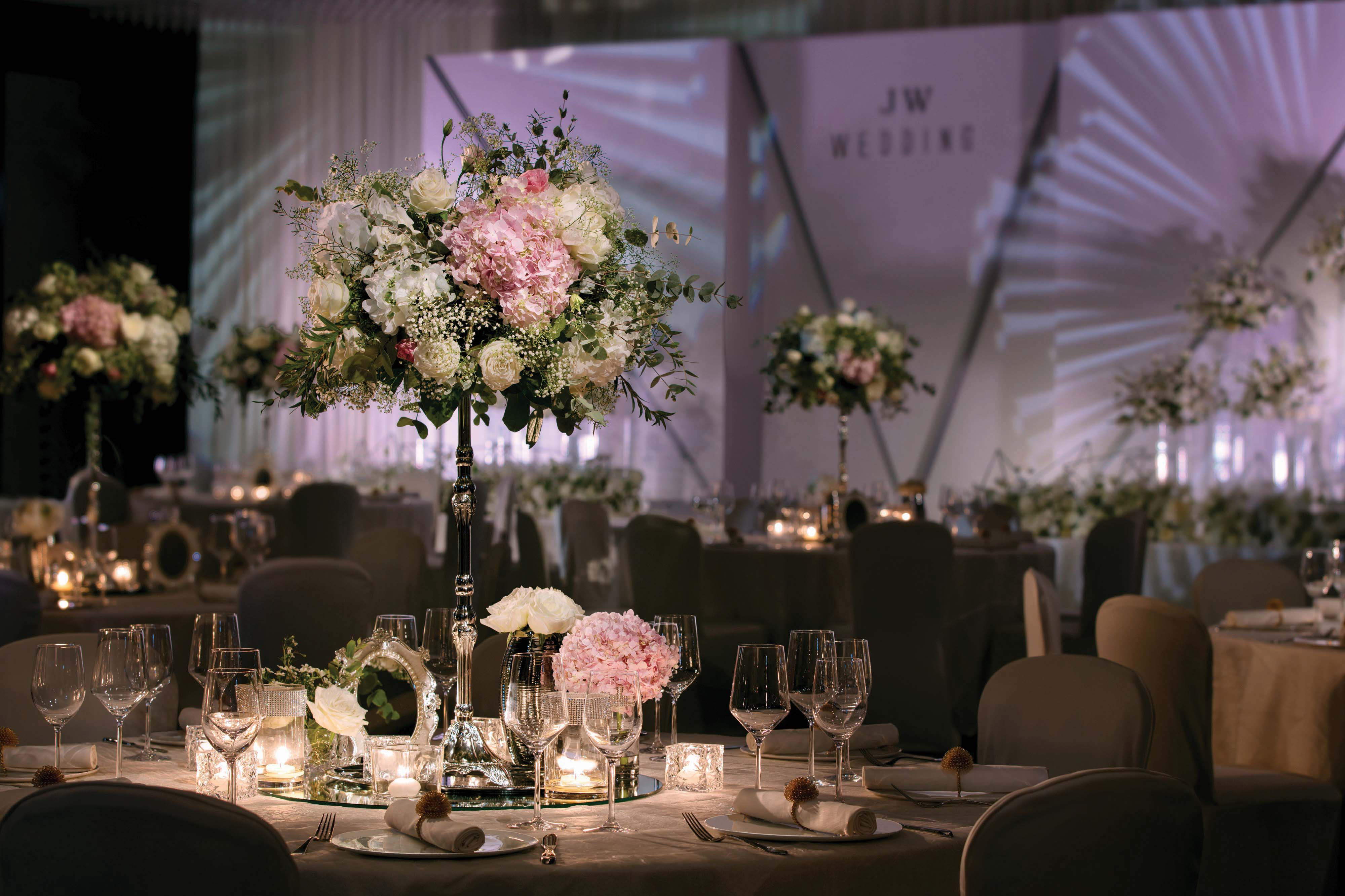 在大喜日子不少得宴請親朋好友,分享喜悅。JW 萬豪宴會廳佔地 8,142 平方呎,採用無柱式設計,結合 15 呎特高樓底,空間開揚無阻,氣派非凡。場地備有璀璨的意大利吊燈與先進照明系統,配合 12 米闊高清 LED 幕牆,為婚禮打造震撼視覺。宴會廳可依席數需求彈性分隔,無論大宴小酌皆能完美契合。