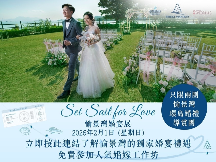 邀請您參與一天〈度假式環島婚展〉,親身體驗極具異國風情的臨海浪漫婚禮!2026年2月1日(星期日)《SET SAIL FOR LOVE 愉景灣婚宴展》,為您的婚禮展開浪漫旅程~香港愉景灣酒店座落於大嶼山,位處香港國際機場及中環...