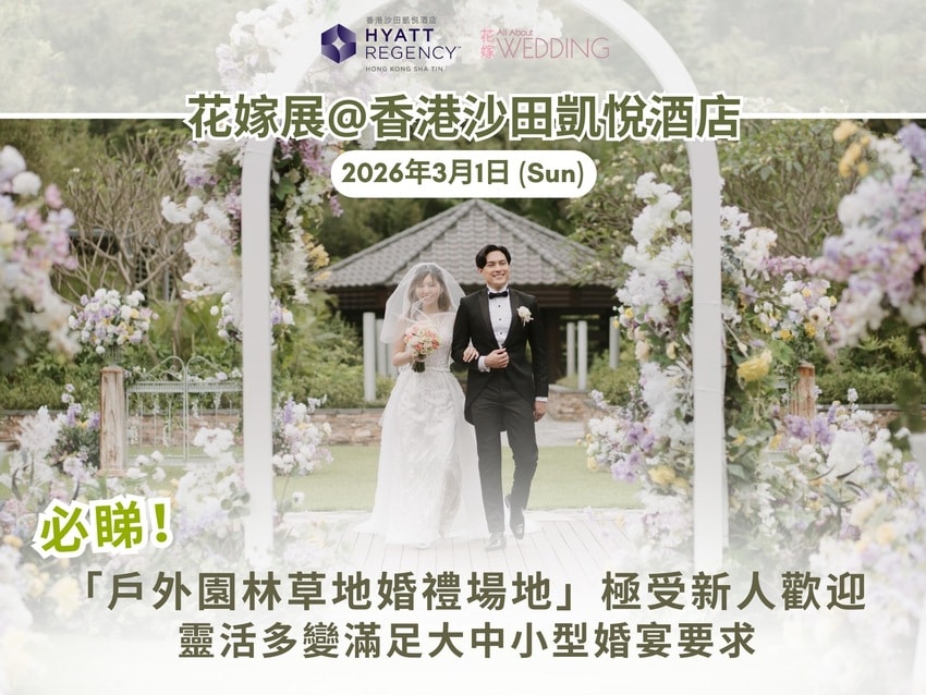 2026年3月1日 (星期日) 《花嫁展@香港沙田凱悅酒店》|超人氣「戶外園林草地婚禮場地」|靈活多變滿足大中小婚宴要求|登記免費參觀