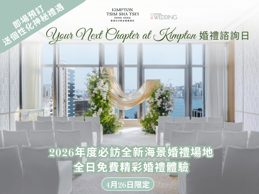 是次婚禮諮詢日將首度開放兩大全新海景婚禮場地,誠邀準新人率先親臨體驗。2026年4月26日 (星期日)《香港尖沙咀金普頓酒店 "Your Next Chapter at Kimpton" 婚禮諮詢日》不僅讓您成為首批參觀的準新人,當日更精心準備多項多項精彩活,包括模特兒展示婚紗禮服潮流及現場婚禮樂隊演出等。凡即場預訂婚宴,更可尊享個性化神秘禮遇,請即登記~
