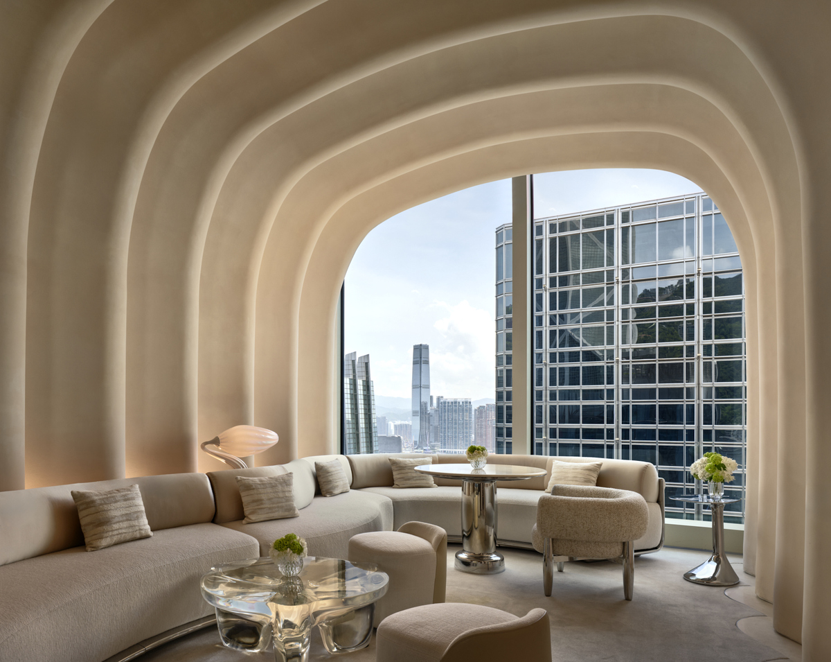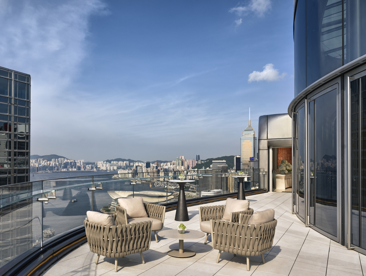 - 擁有八米高玻璃天幕與落地玻璃窗,可盡覽 270 度城市天際線與維港景致